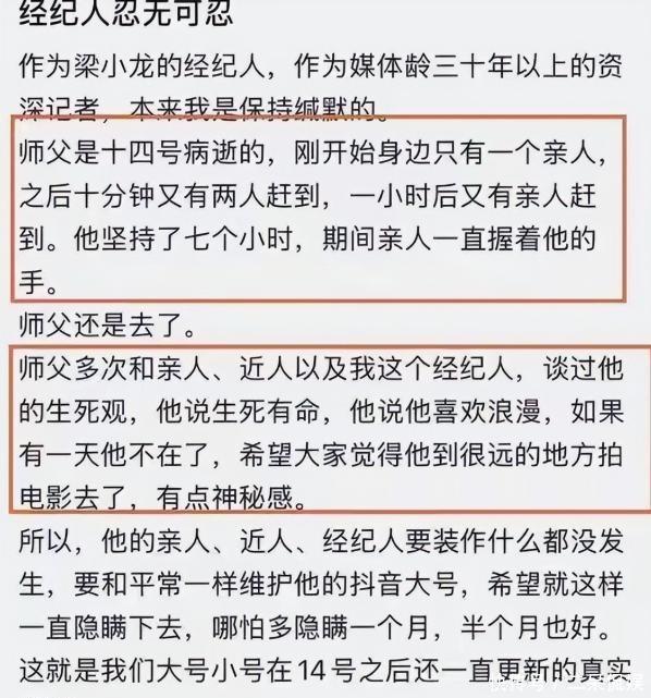 经纪人解释遗愿,陈光标却不买账1月19日,梁小龙的经纪人兼徒弟出来发声了。他说老爷子生前就交代过,走了以后别张扬,让大家觉得他只是"去很远的地方拍电影了",保留点神秘感。所以账号才继续更新,想让粉丝慢慢接受这个事实。听着挺浪漫,挺感人。可陈光标不这么看。