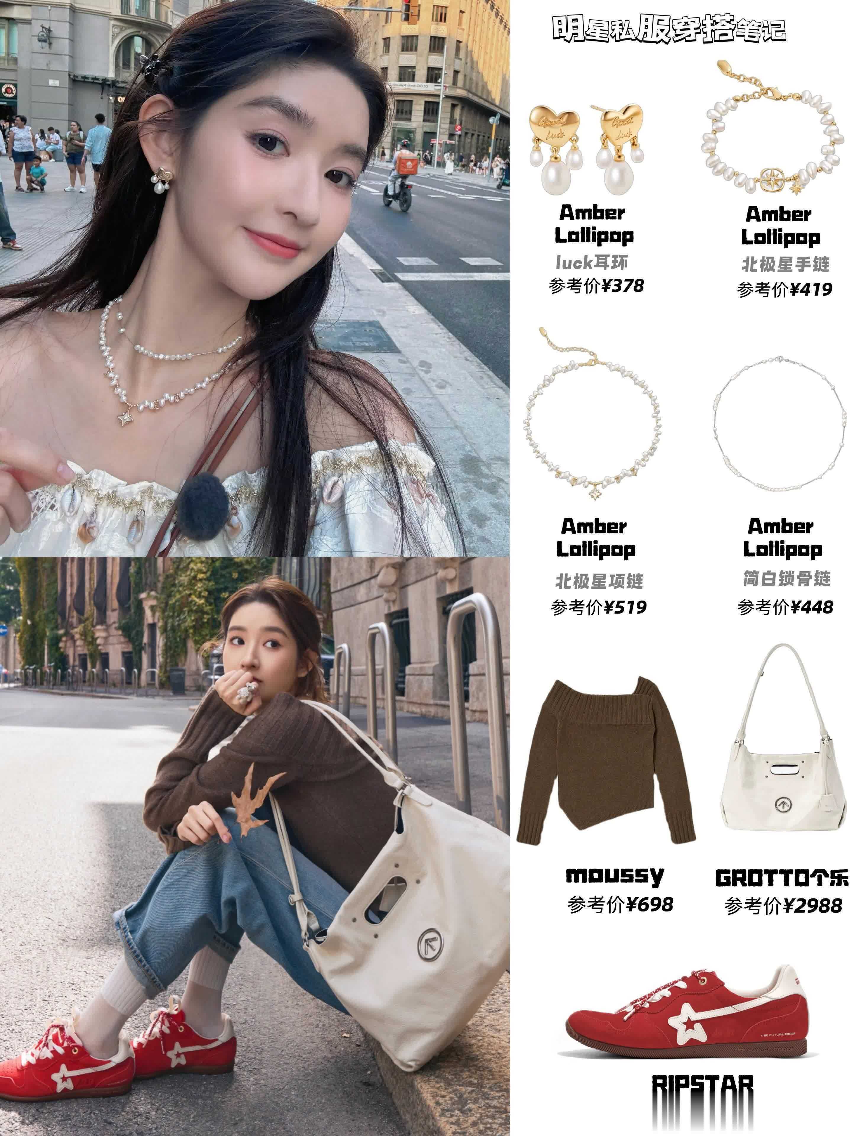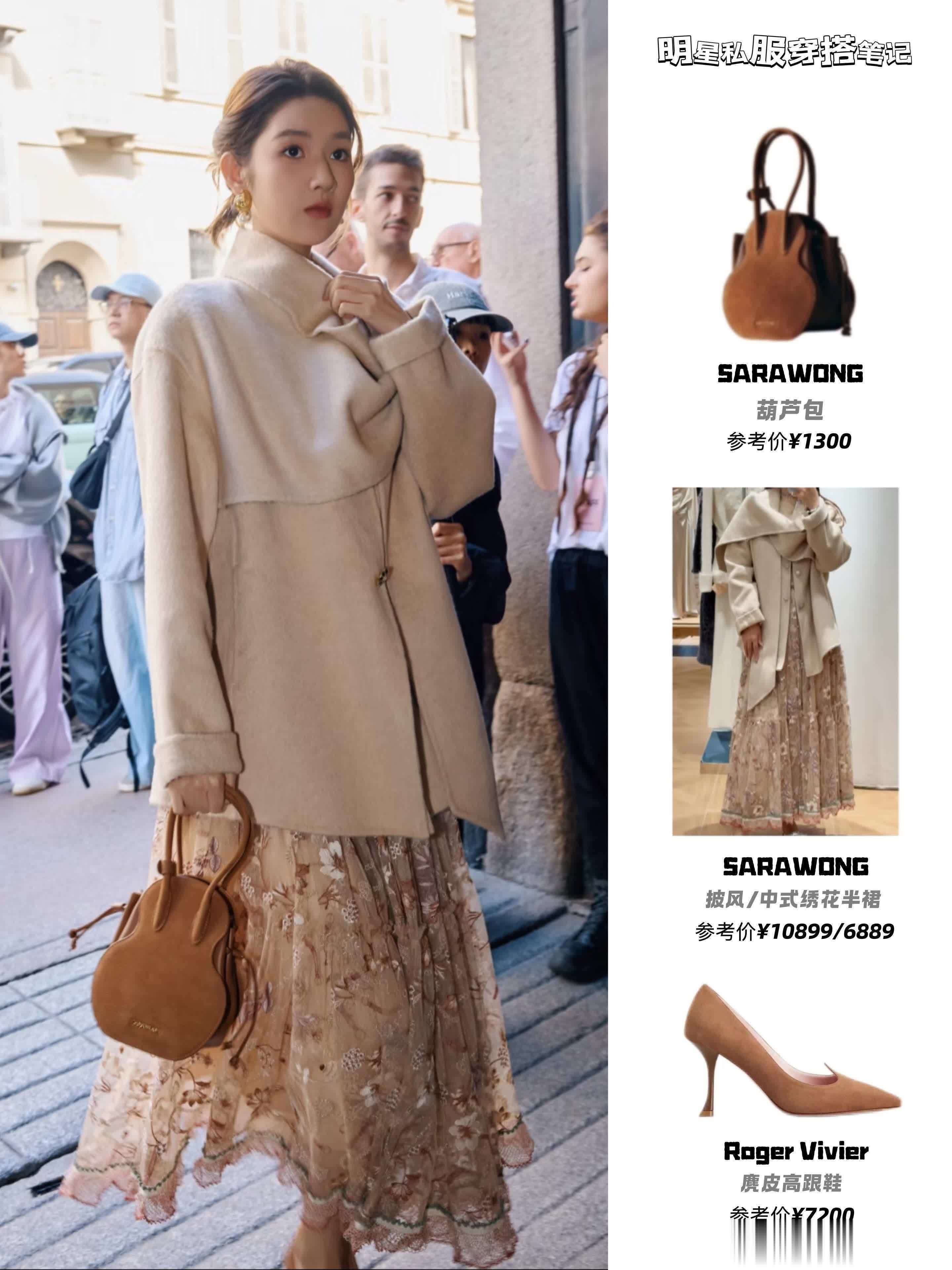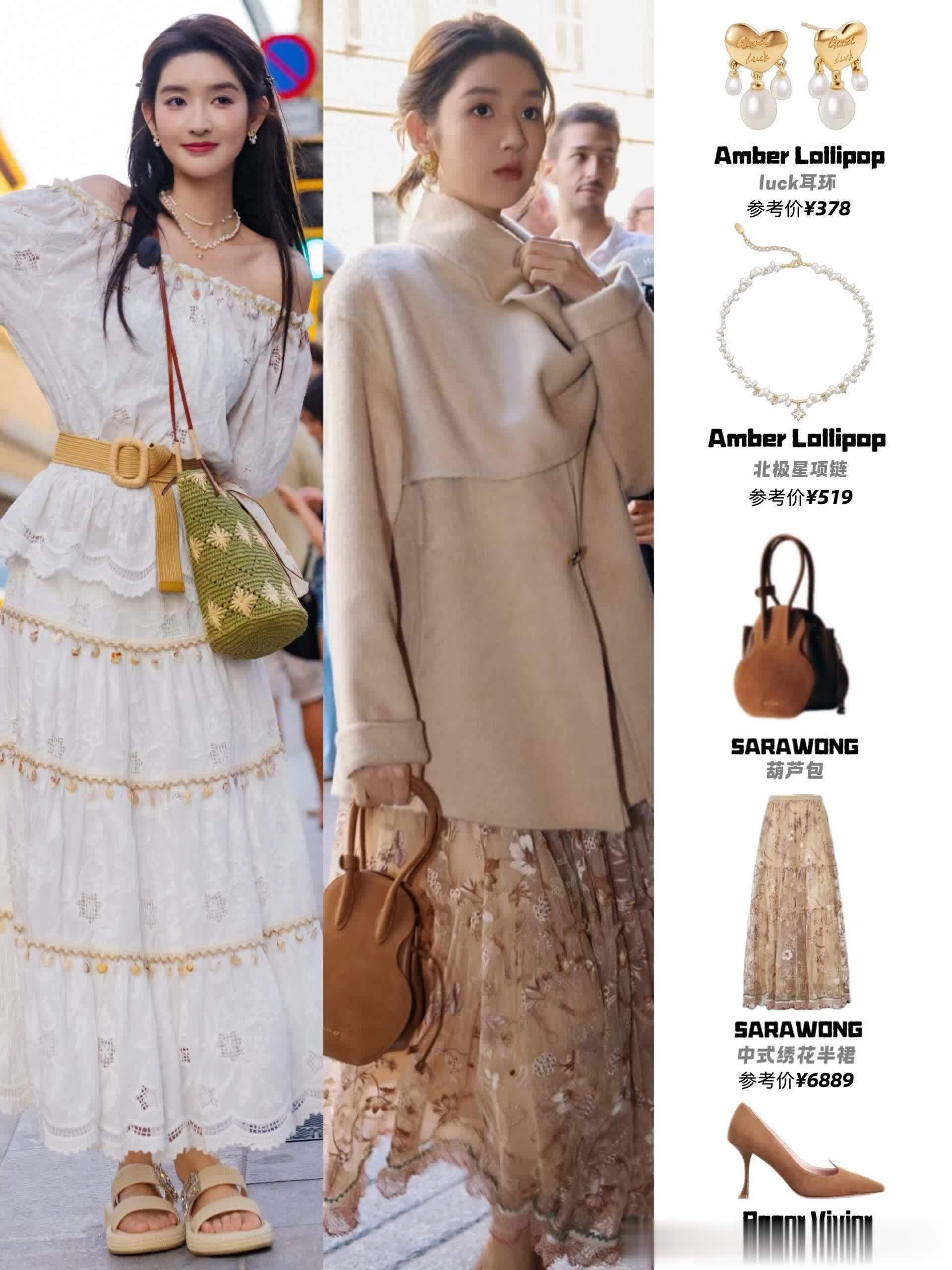 关键是这些配饰太绝了!左边的珍珠耳环和项链,右边的棕色小包,都给整体造型加分不少。而且品牌选的也很用心,Amber Lollipop的耳环和项链,设计感满满,戴出去不容易撞款;SARAWONG的葫芦包和刺绣半裙,中式元素用得特别高级,一点不土气;Roger Vivier的高跟鞋,鞋型优雅,走路还稳,通勤穿也合适。